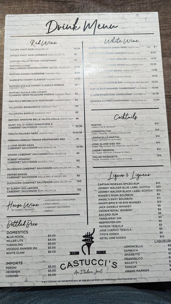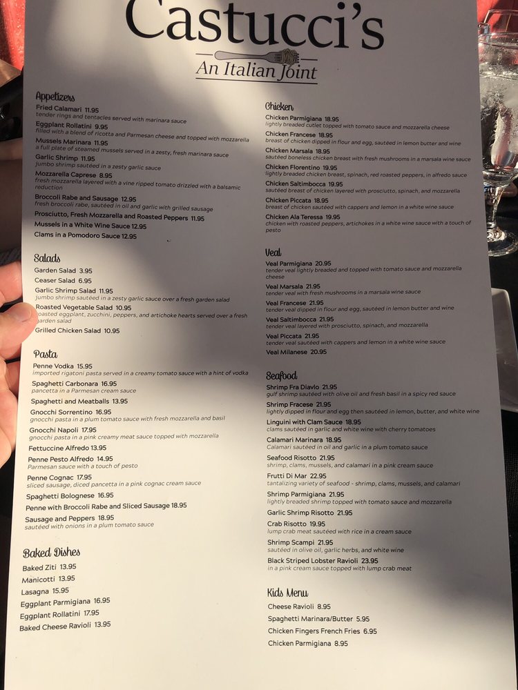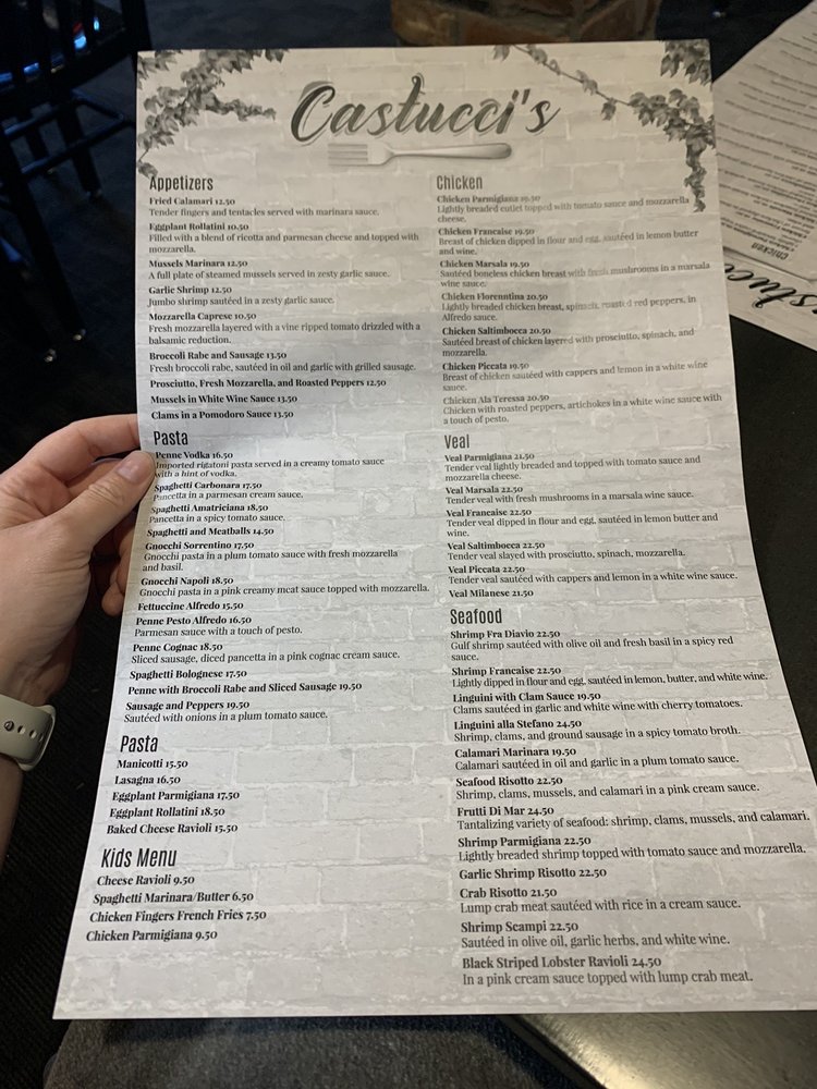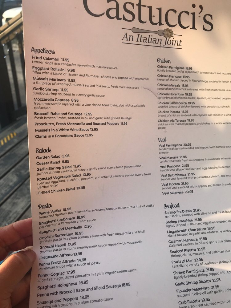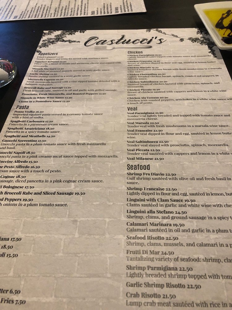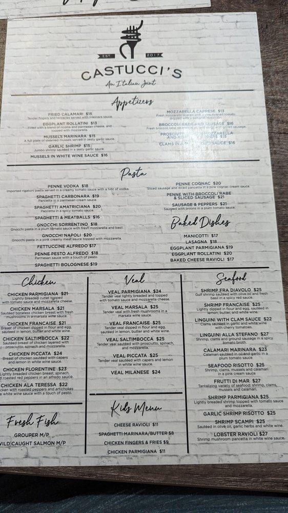 Castucci's an Italian joint in Southport, NC offers a wide range of Italian dishes with options for everyone, including vegan and vegetarian options. The cozy atmosphere provides a perfect setting for a casual meal with friends or family. The menu features delicious dishes such as Mussels with marinara, Chicken Parmigiana with a savory red sauce, and Chicken Saltimbocca with a unique thin brown sauce. The seafood specials, like the Parmesan-encrusted Grouper with butter sauce over risotto, and Salmon with honey sauce over risotto, are described as amazing and heavenly. The homemade Gnocchi is a standout, although some customers mentioned that it was slightly underdone. Overall, Castucci's is a must-visit for authentic Italian cuisine in the Oak Island and Southport area.